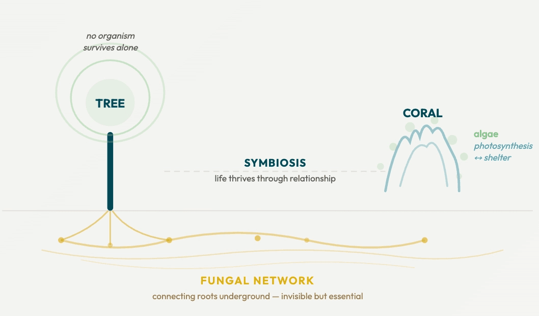 In biology, symbiosis is the recognition that life thrives through relationship. No organism survives alone. The tree needs the fungal network. The coral needs the algae. The system is the unit of survival — not the individual.
