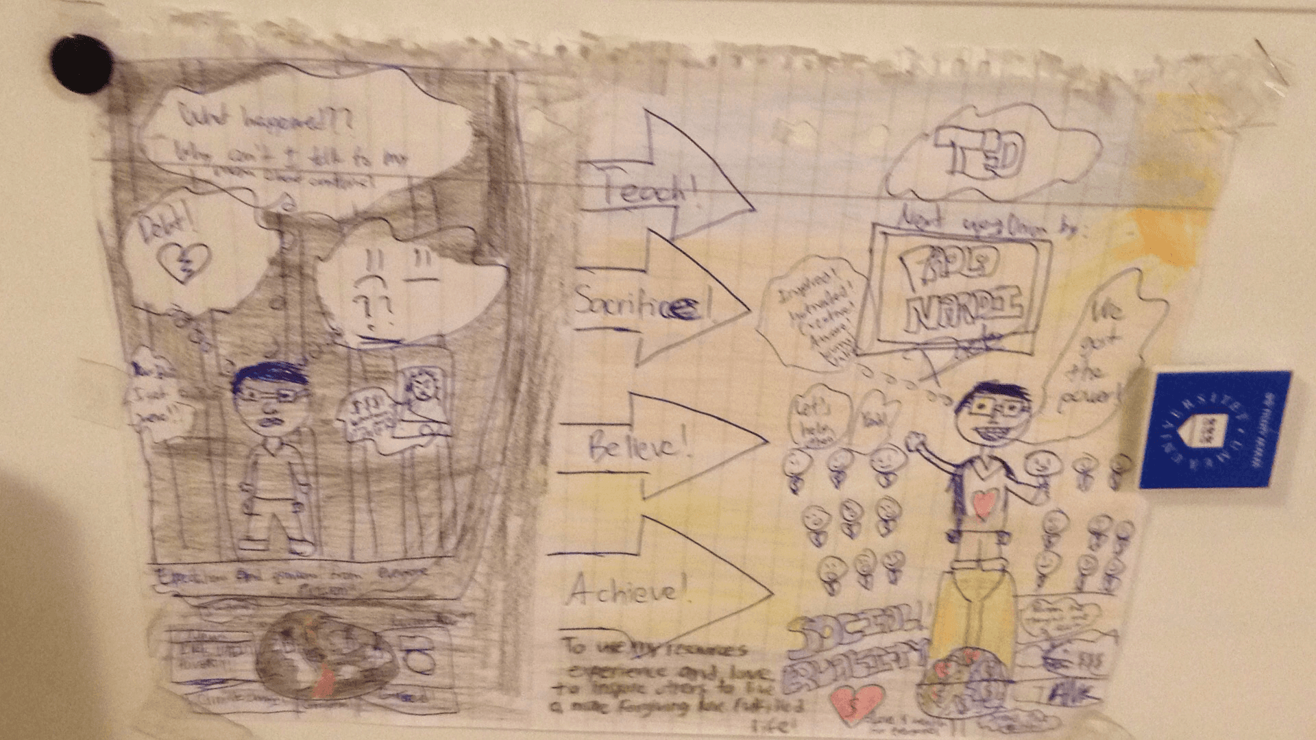 On the right — the world I wanted to help build. People connected back to their hearts. Resources cultivated and shared. Wealth in all its forms — spread and regenerated toward the collective good. I even drew a TED talk called “Unity.”