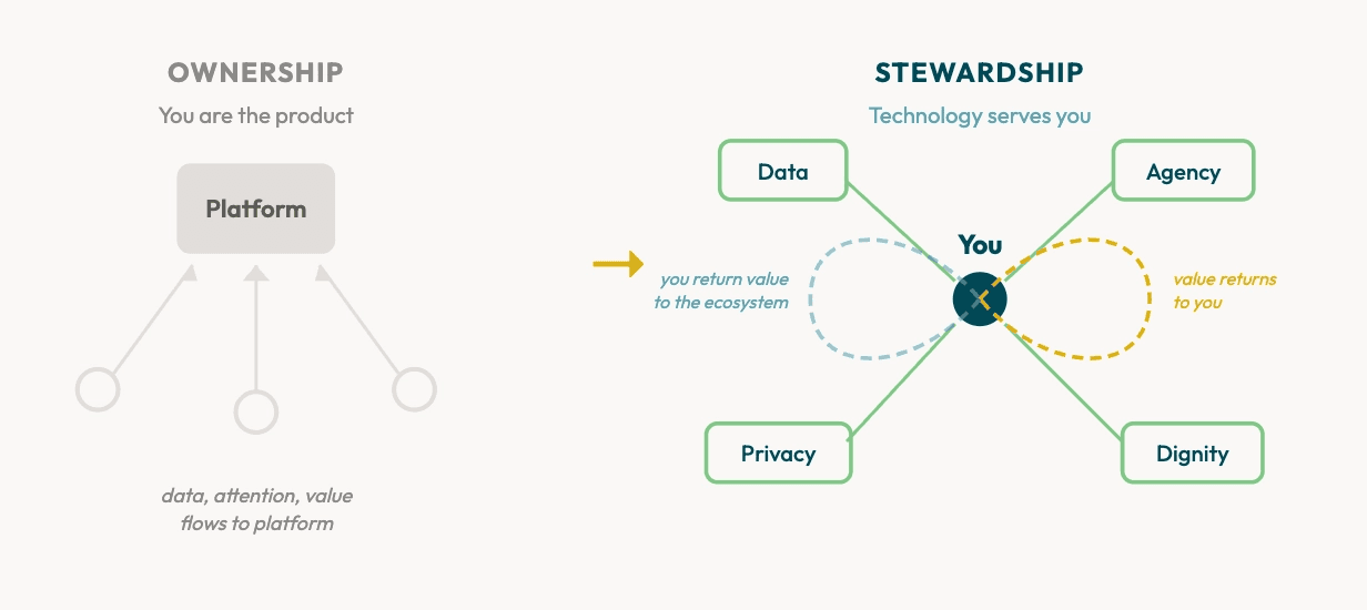 Stewardship inverts this. In a stewardship model, technology serves at the discretion of the people who use it. Your data remains yours. Your relationships remain yours. The system’s job is not to capture your attention — it is to restore your agency and help you act with intention.