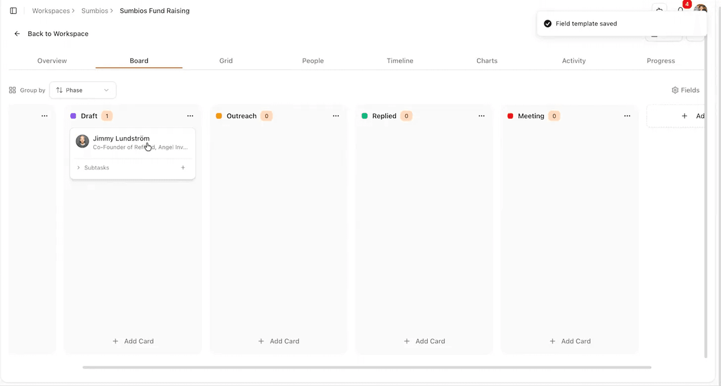 Missions is the layer where the map becomes action. You define a goal — raising a round, building a team, landing a partnership — and O continuously recommends people from your and your friends' networks who might help. You track outreach, add fields, set reminders, move contacts through stages like cards on a board.